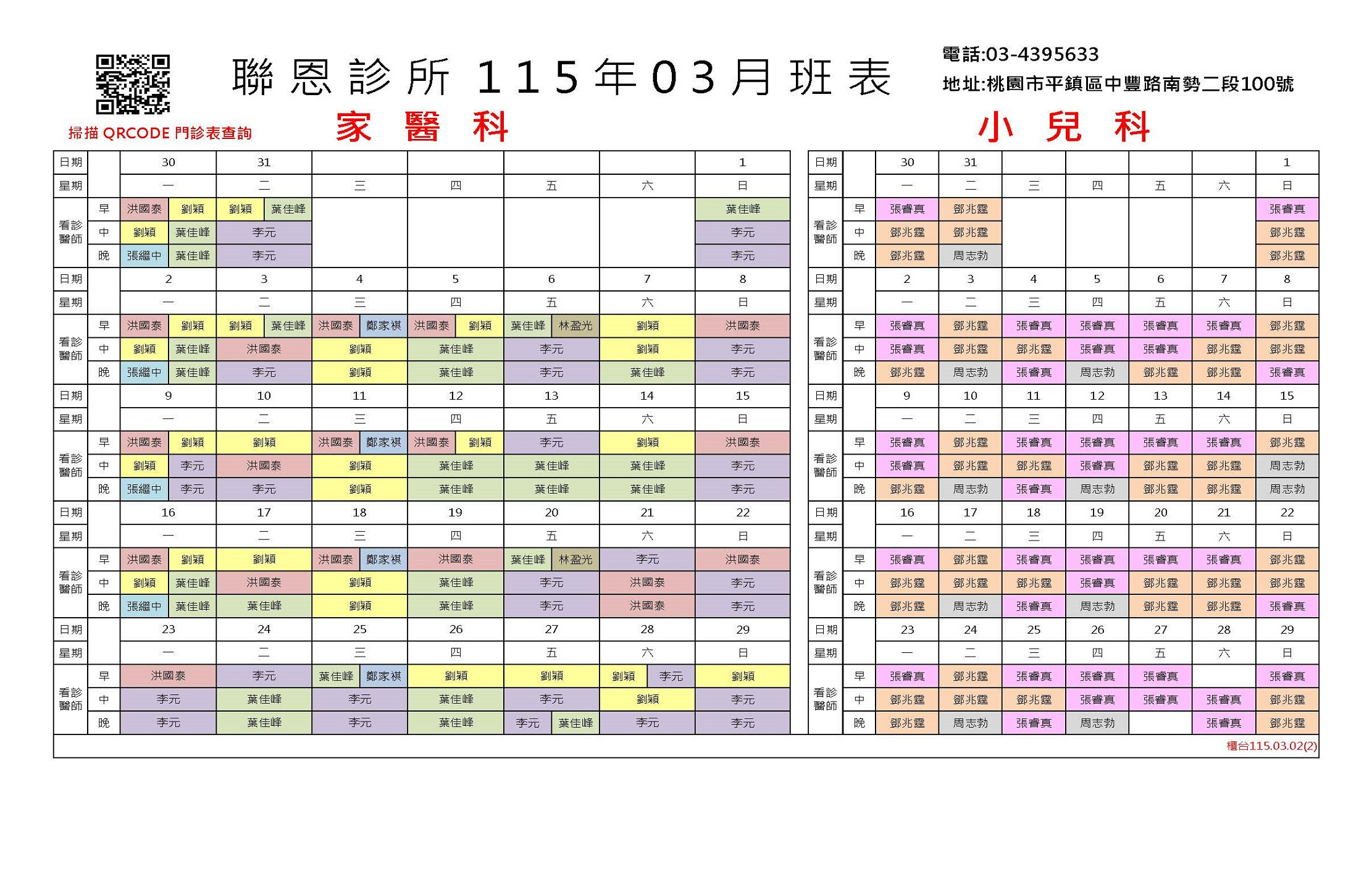 備註:● 為看診時間、休為非看診時間