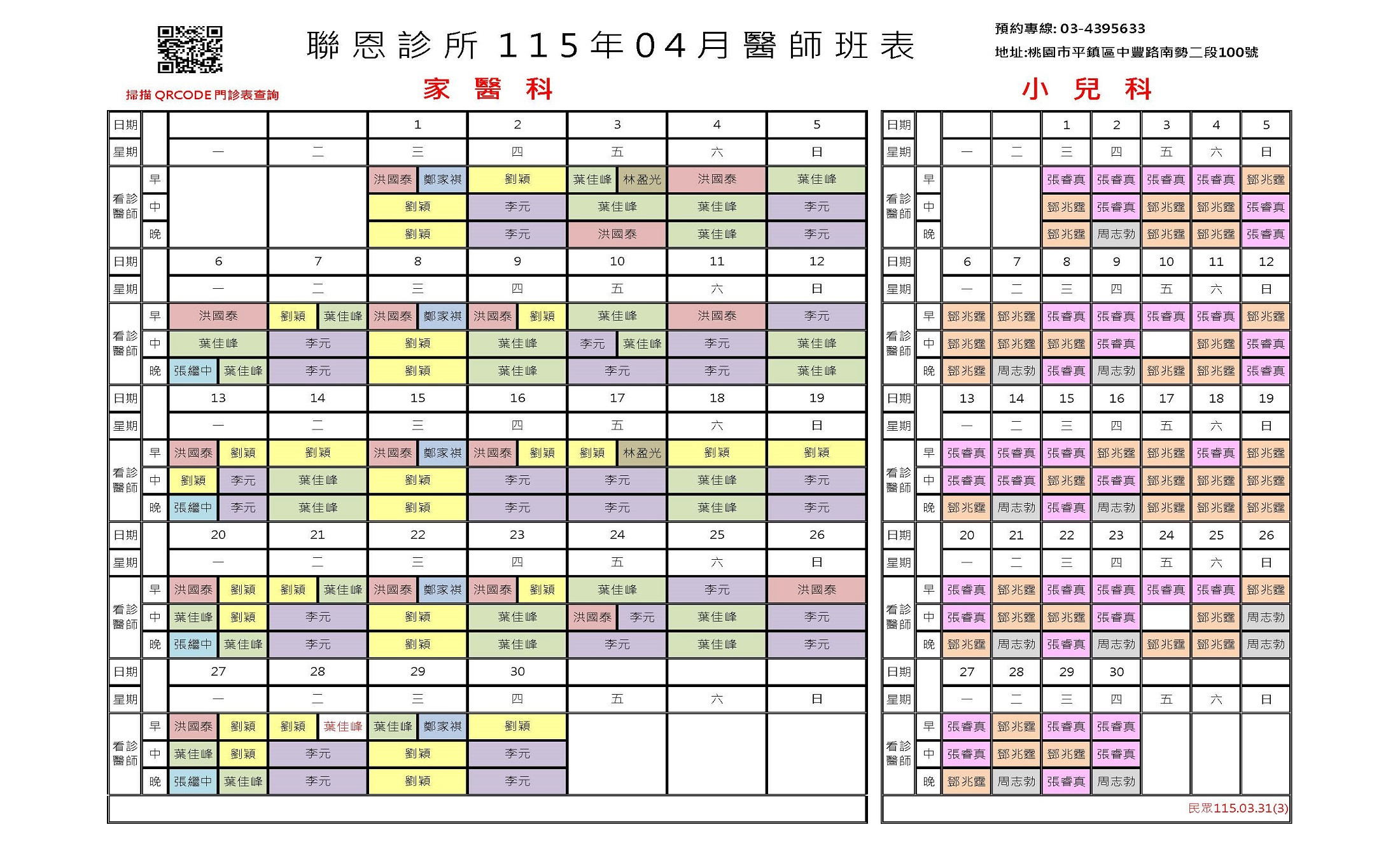 本班表僅提供參考,實際看診醫師以當天現場公佈為準