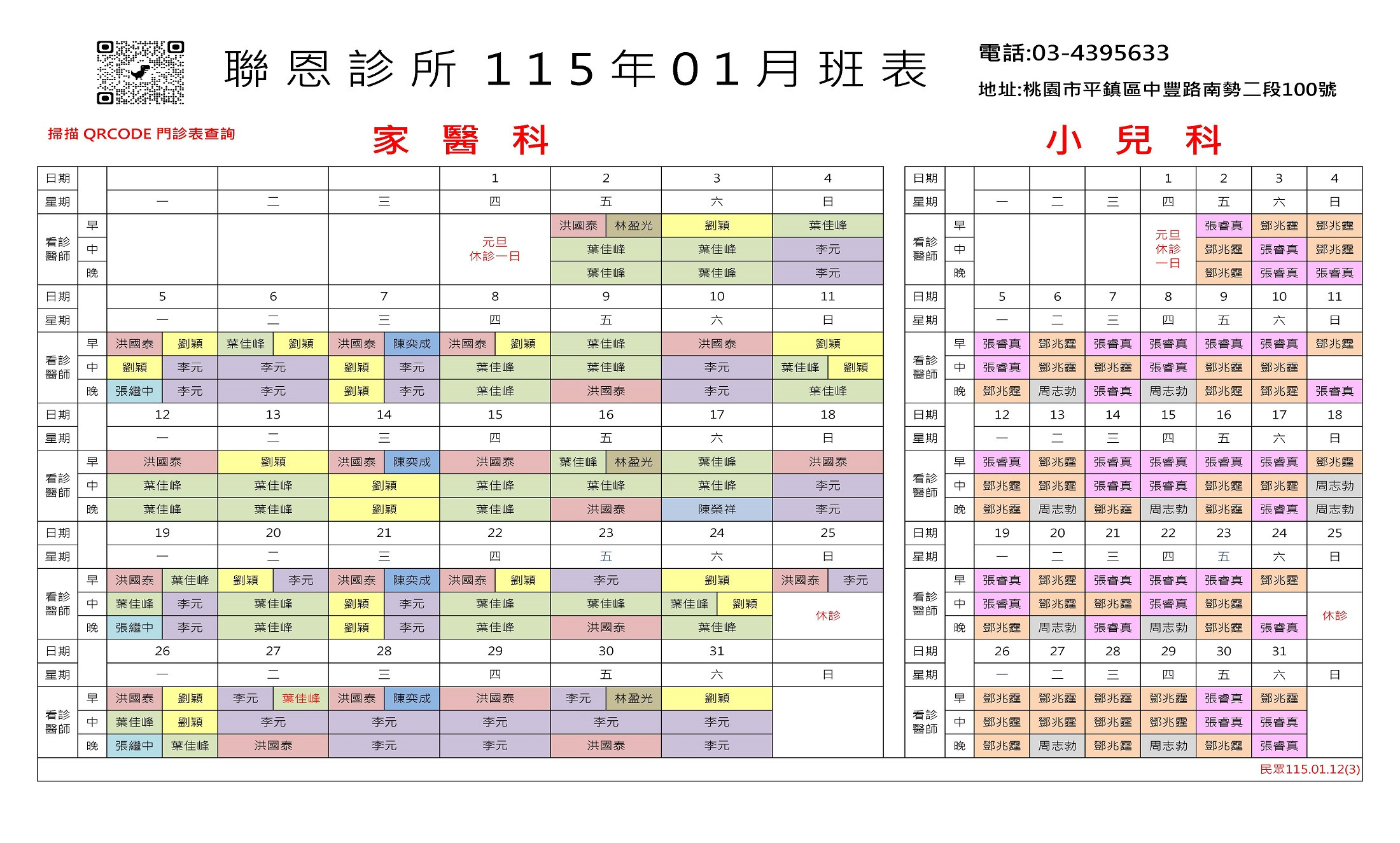 本班表僅提供參考,實際看診醫師以當天現場公佈為準
